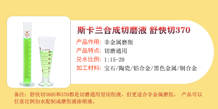 • SKALN  Squastar 370適合寶石,陶瓷,鋁合金,黑色金屬和銅合金的磨和切削加工。 產品可以任意比例加水配制成磨削液濃縮液。建議稀釋比例:  5%。